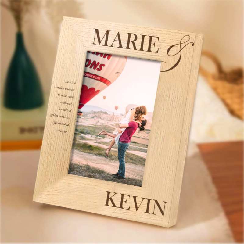 The creative design is delicately UV printed on a handsome, rich wood frame, then personalized with your names, words, and photo for a lasting and memorable keepsake for years to come. You can choose horizontal or vertical orientation.