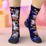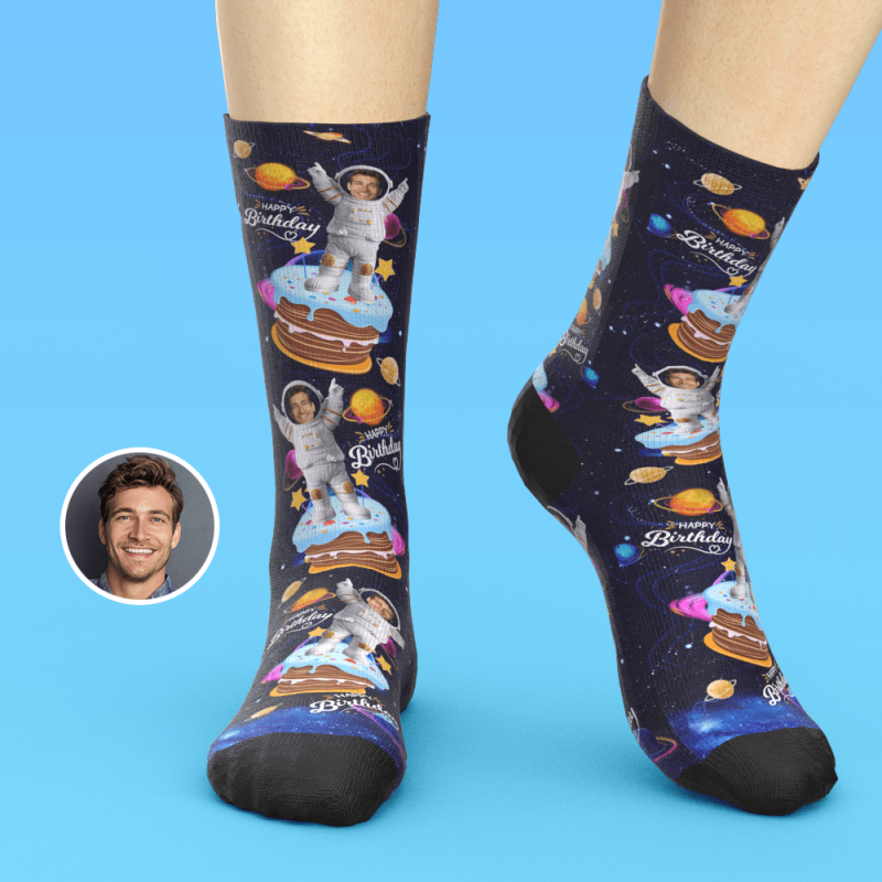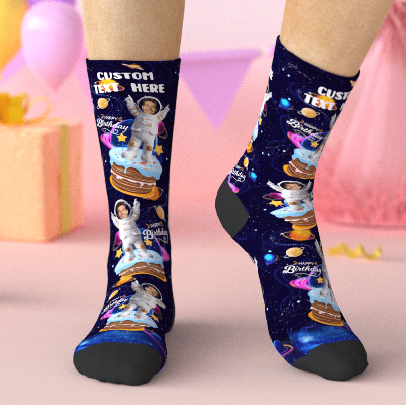 Custom Socks Face Socks with Galaxy Planet and Big Cake Personalized Birthday Gifts for Him