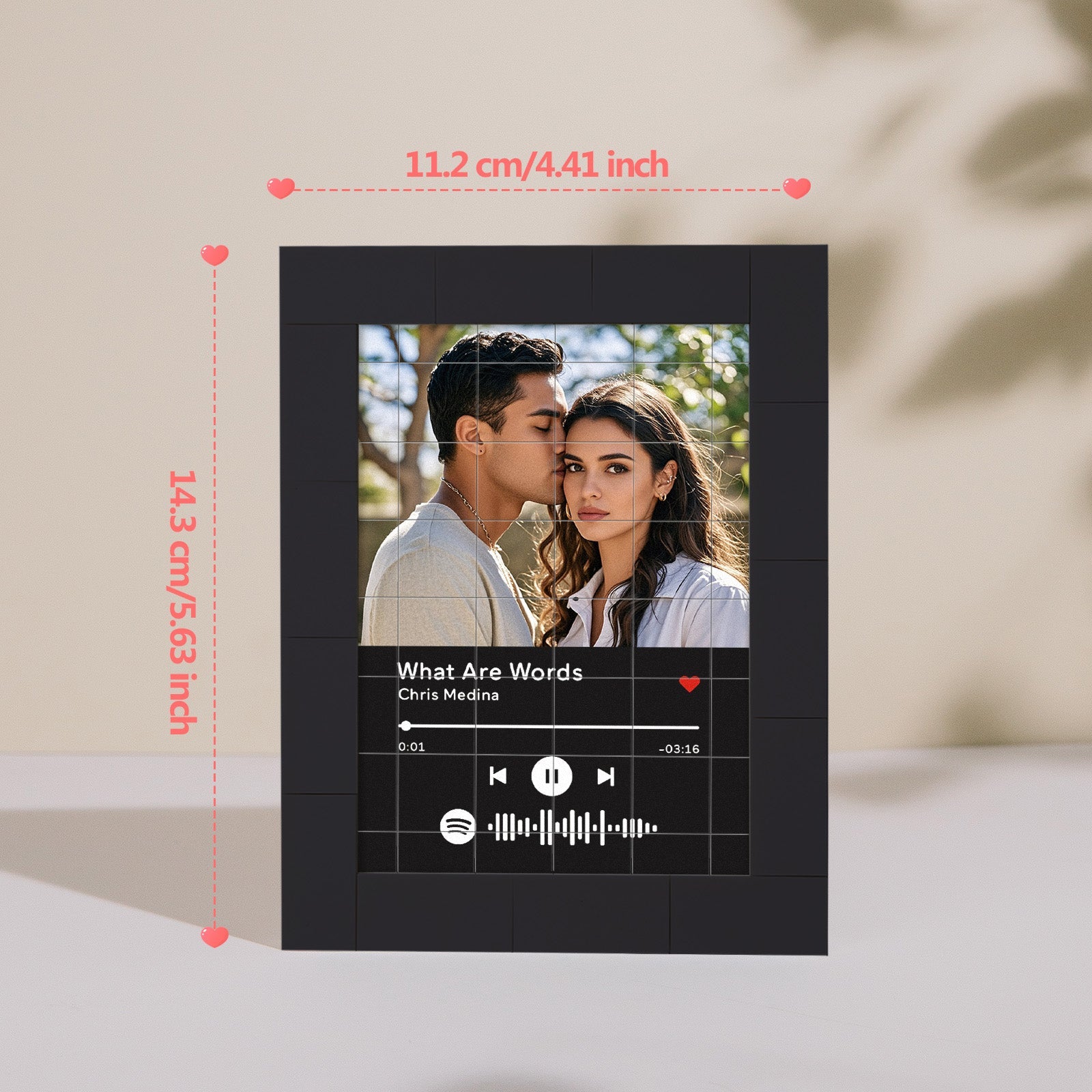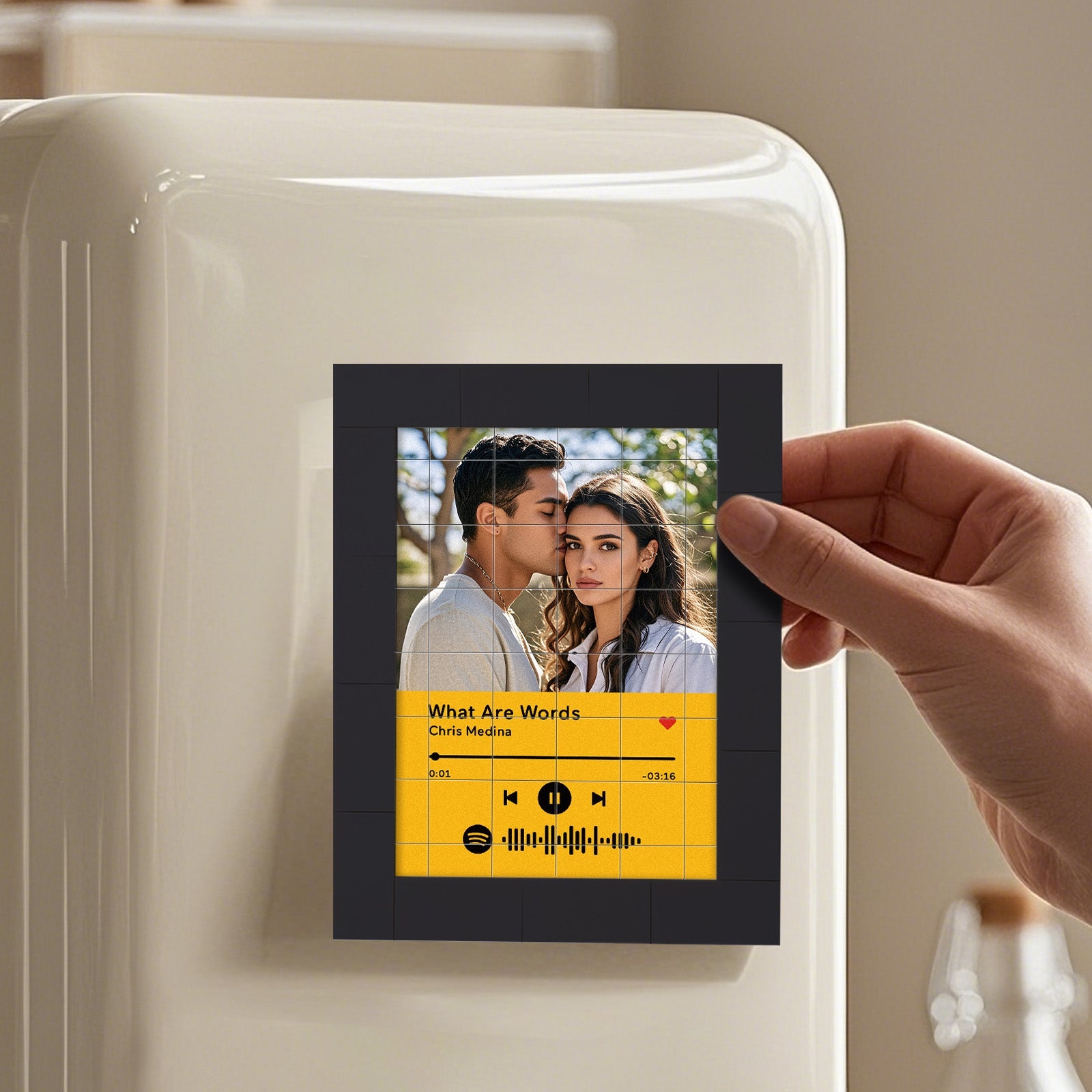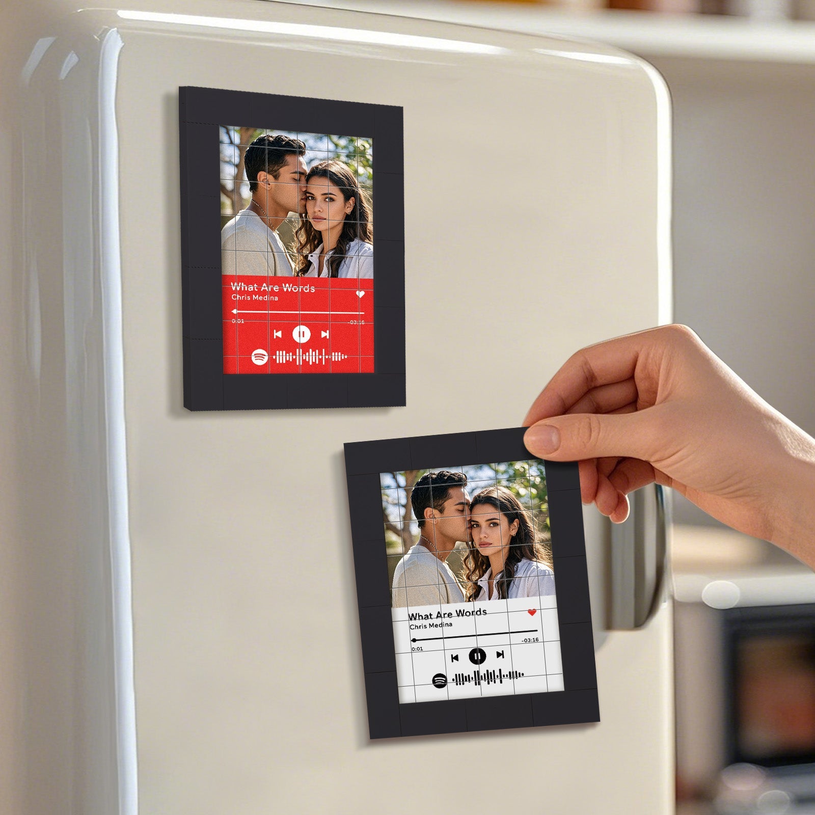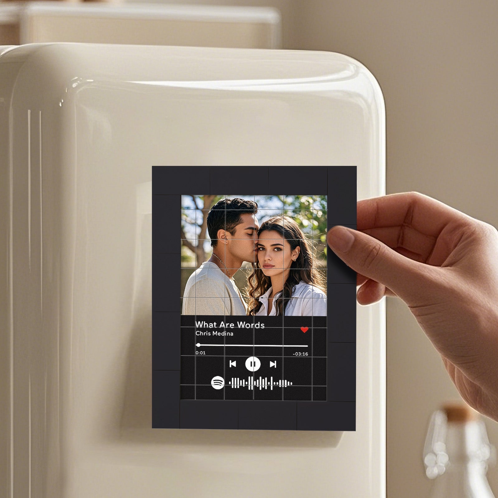 Bring your favorite music to life with our Customized Album Fridge Magnet! This innovative magnet is more than just a decorative piece -it's a functional, custom the Spotify code magnets, ?You can choose any song title, artist name, and favorite photos you want, all can be imprinted on the brick and you can generate a unique Spotify code. Please note that the brick itself does not emit music. You have to scan the code on the Spotify app, after scanning the code on Spotify, your song will start playing immediately. At Christmas, I believe this is the most romantic gift, play the most beautiful music for your love.