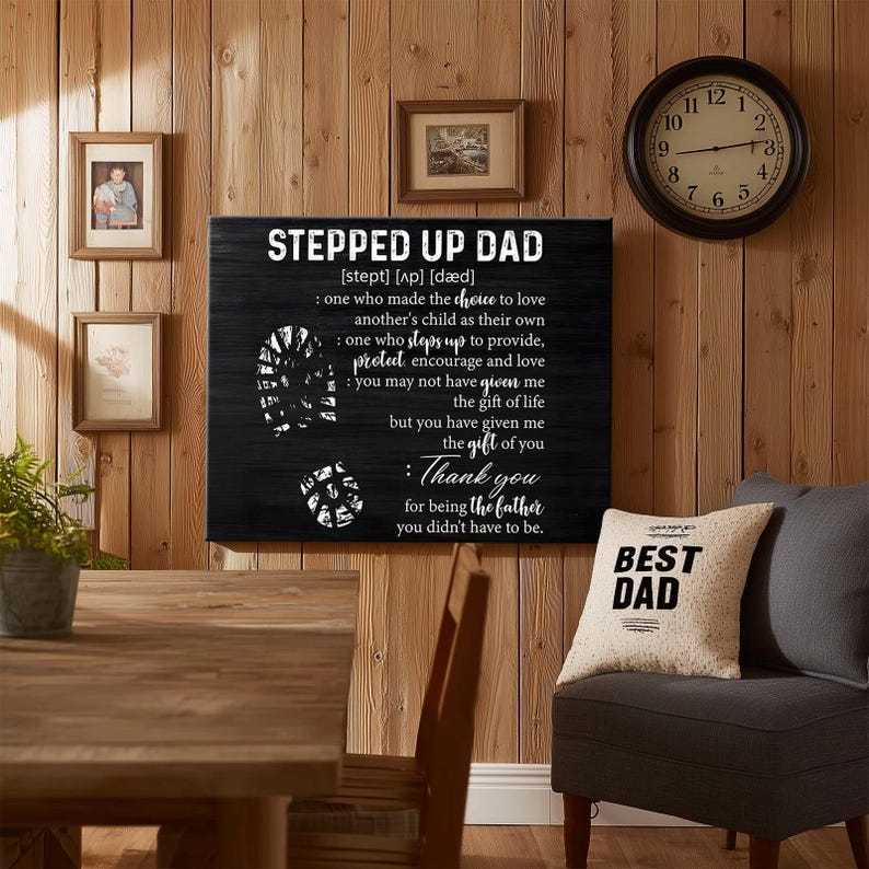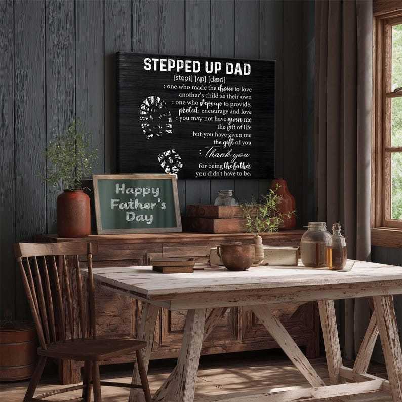 This striking wall art offers a dictionary-style tribute to the father figure who stepped in and became your biggest protector, encourager, and source of love. With elegant black-and-white contrast and a rustic masculine finish, it's the perfect way to say thank you for being the dad he didn't have to be.