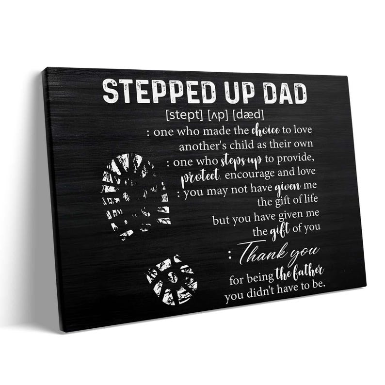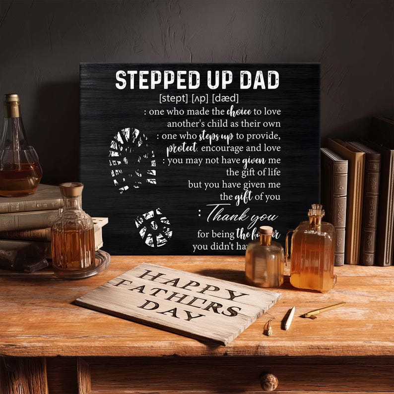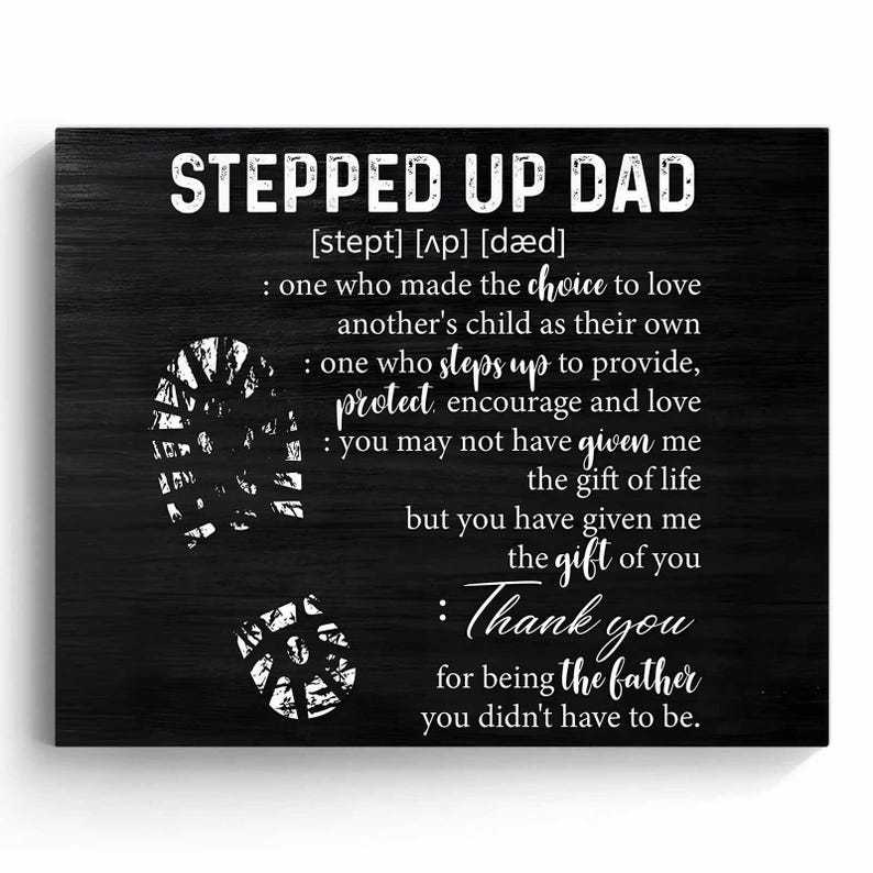 Honor the strength, love, and commitment of a stepdad or bonus dad with this bold and heartfelt canvas print. Featuring a black wood-style background, distressed typography, and meaningful boot prints, this artwork defines what it truly means to be a "Stepped Up Dad"-a man who loves by choice, not obligation.