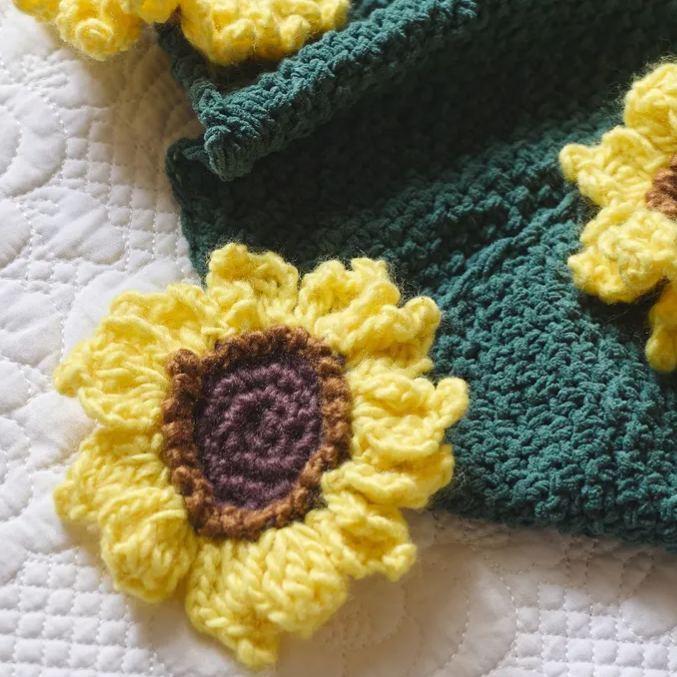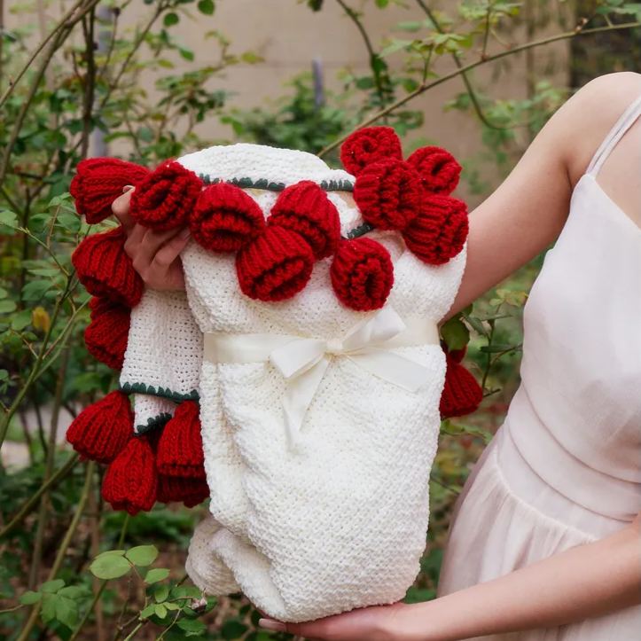 Hand-Knitted Red Rose & Sunflower Blanket Ready-Made Gift for Mother's Day