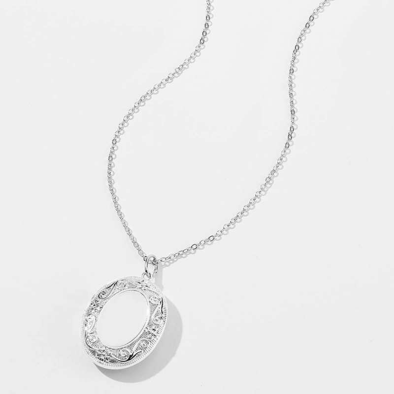 Oval Photo Locket Necklace With Engraving Name Embossed Platinum Plated