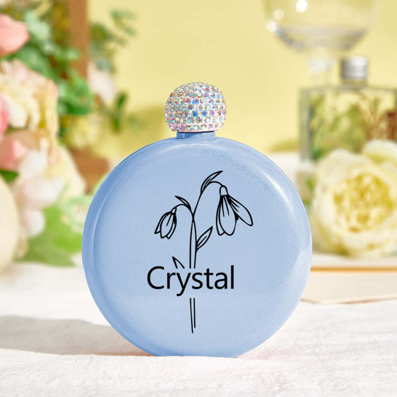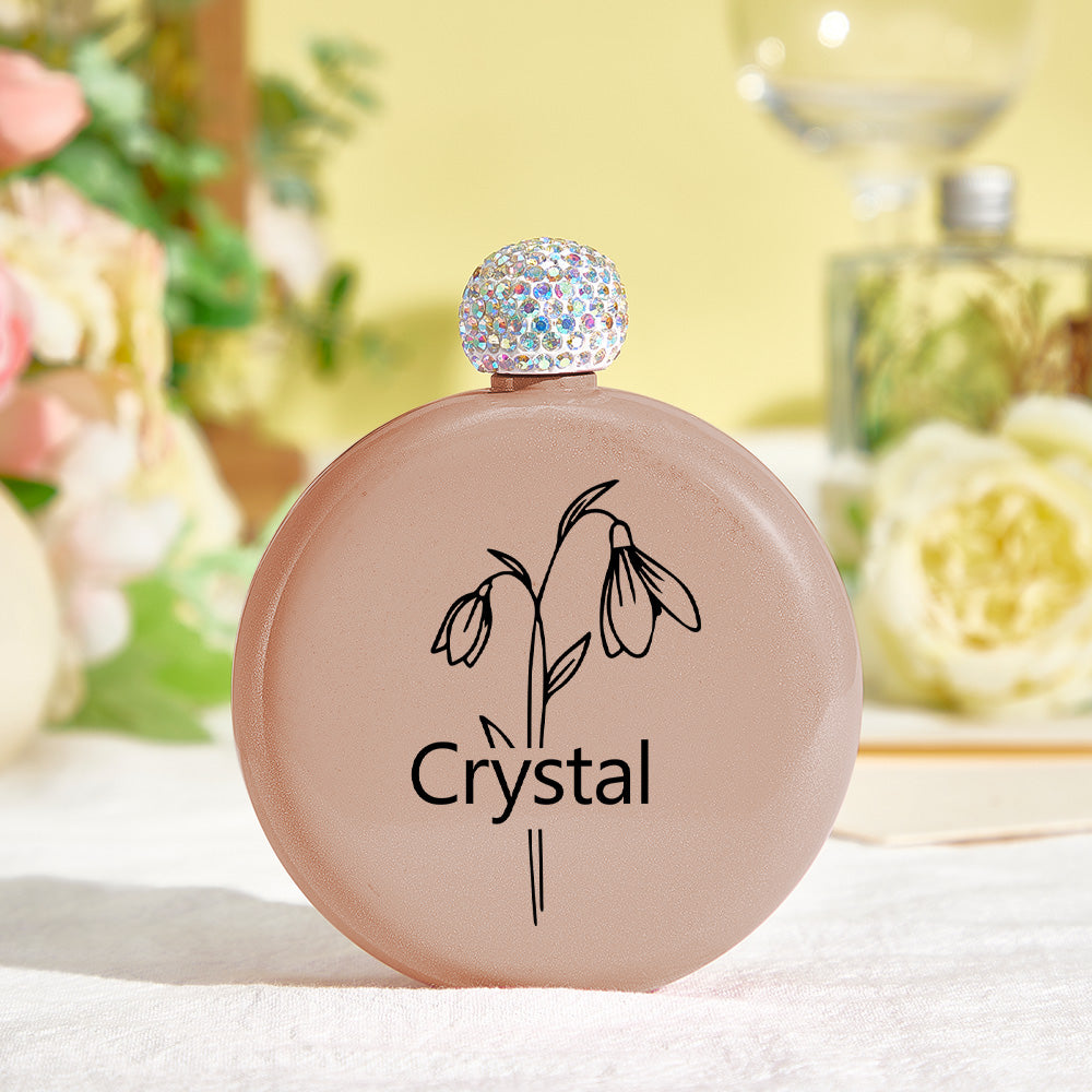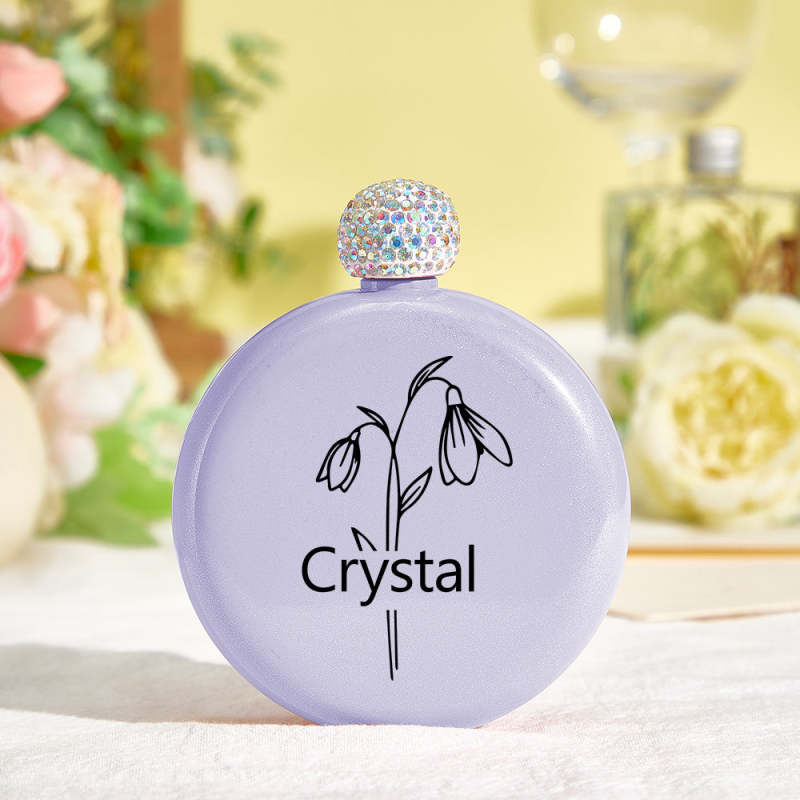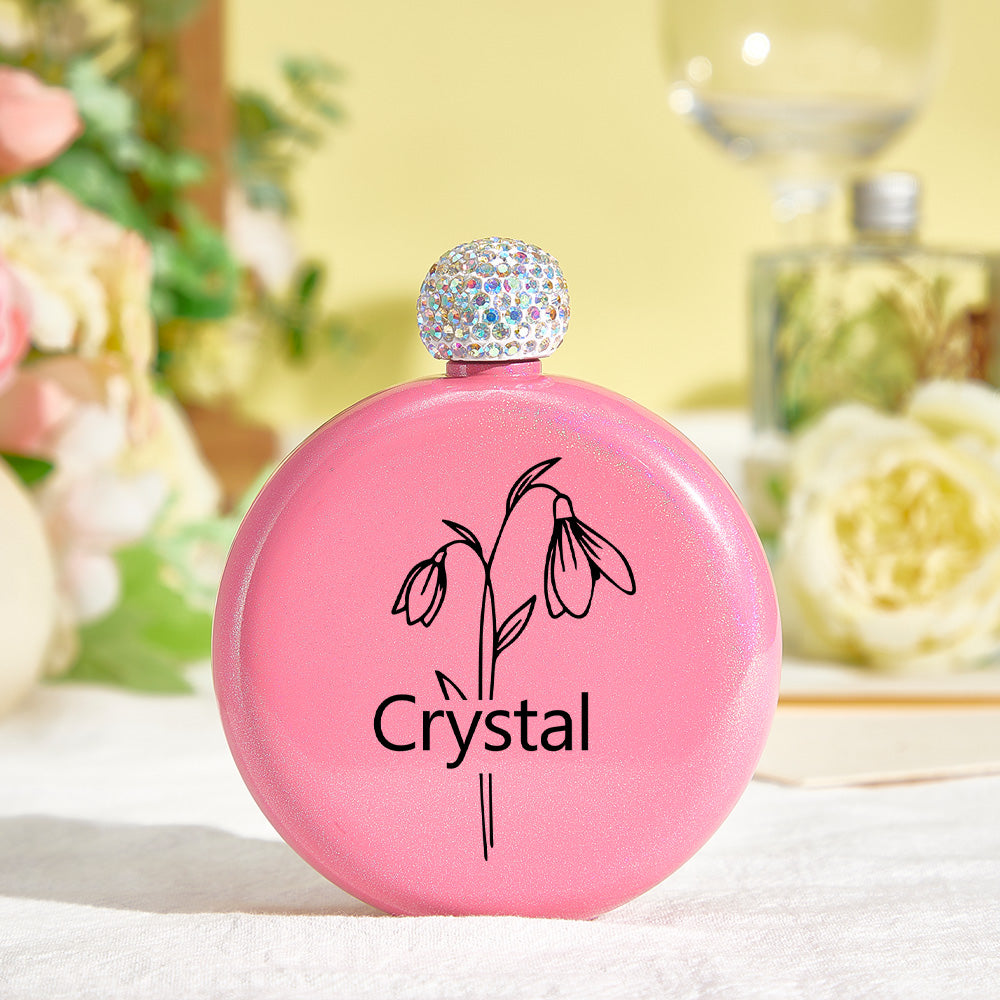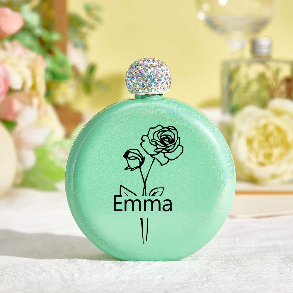 Personalized Birth Flower Round Flasks with Name 5oz Glitter Flask Wedding Birthday Gift for Her