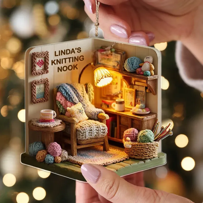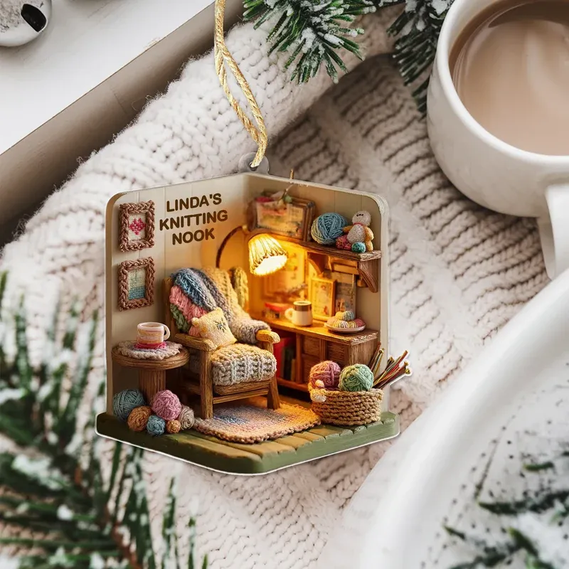 Create a warm holiday atmosphere with this Personalized Knitting Nook Ornament, designed like a cozy little corner for every knitting lover. Featuring a soft armchair, colorful yarn balls, knitting needles, and a glowing lamp, it captures the comfort and joy of handmade crafts.