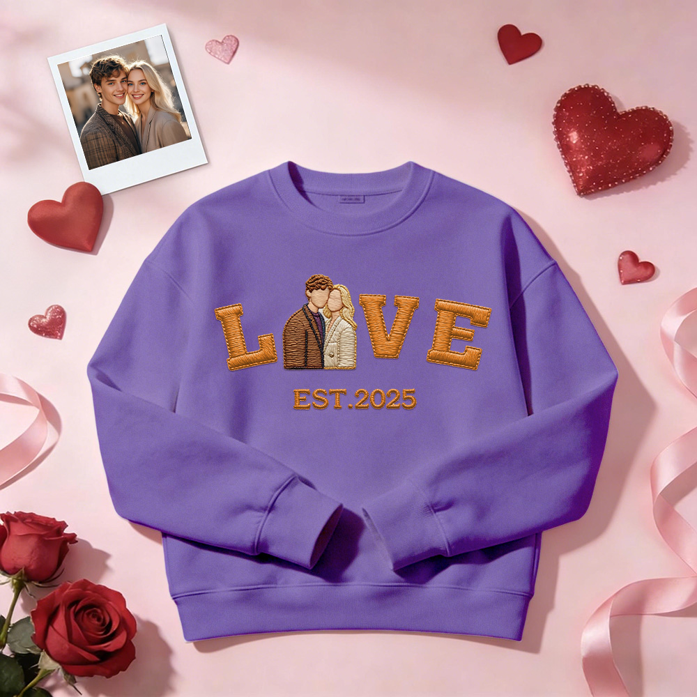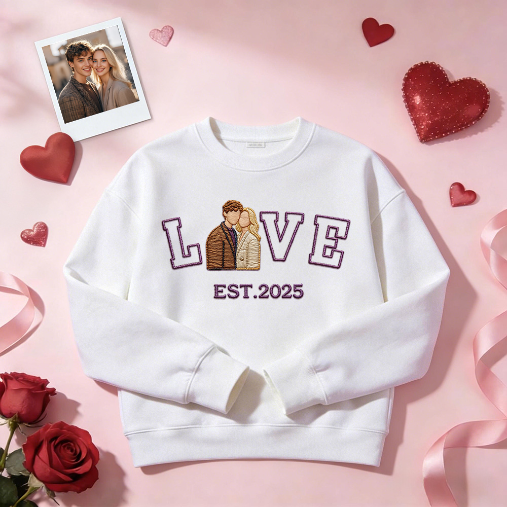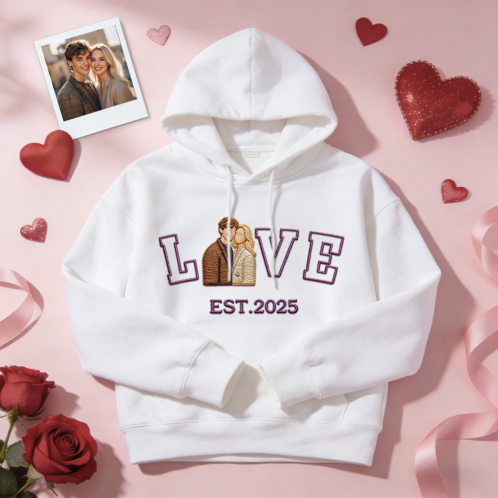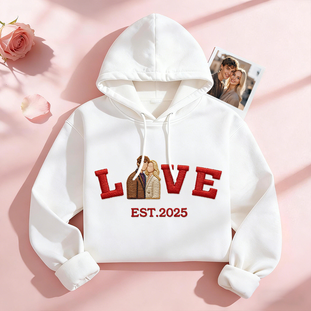 Celebrate your love with a personalized embroidered couple sweatshirt or hoodie, crafted to turn your favorite photo into a timeless stitched design. Featuring a custom couple portrait, romantic LOVE text, and your special EST year, this piece is made to commemorate meaningful moments in a subtle yet lasting way.