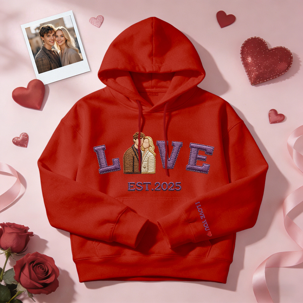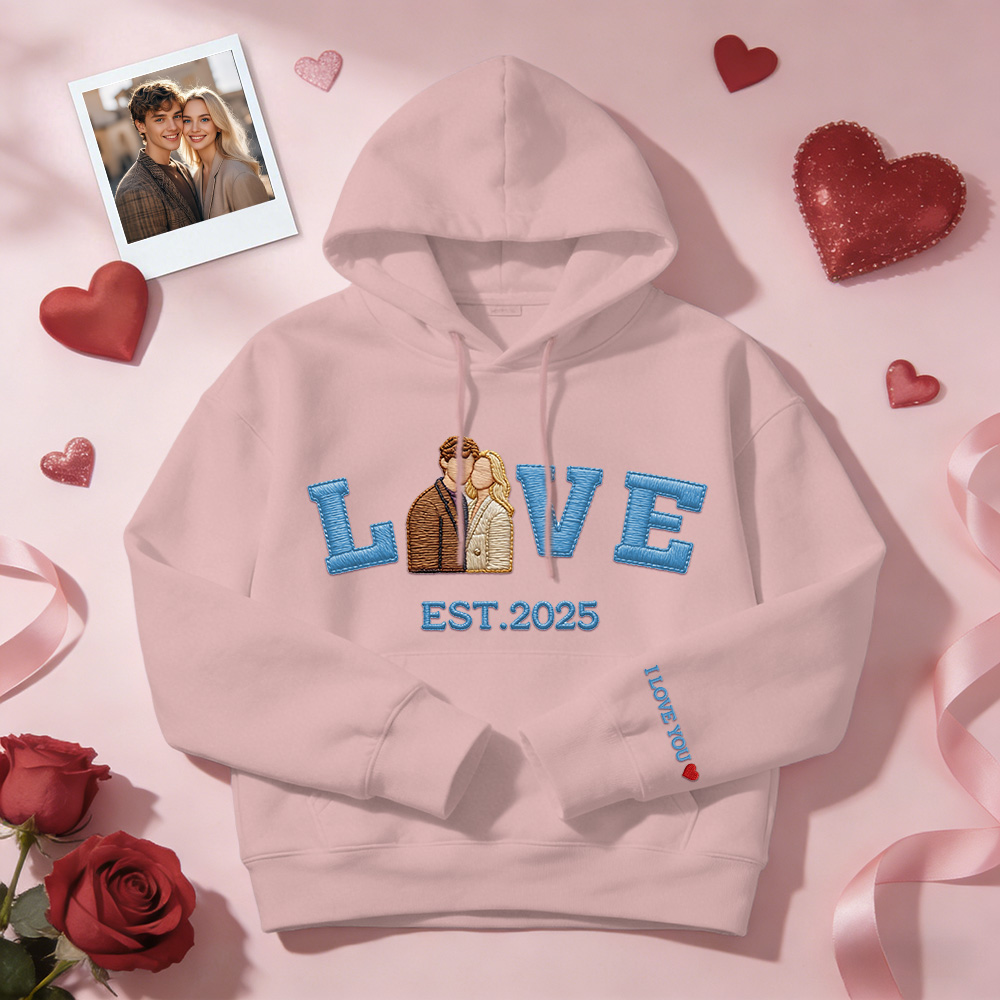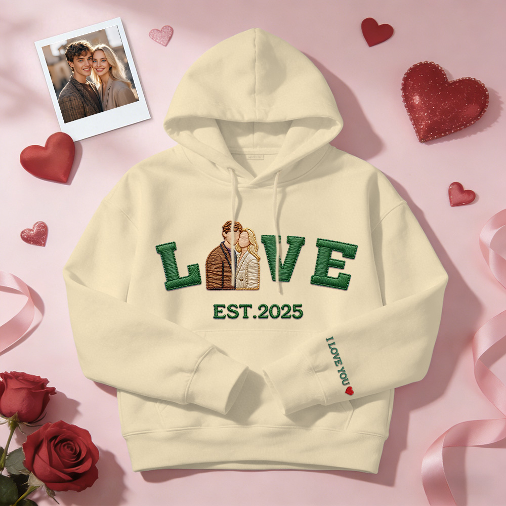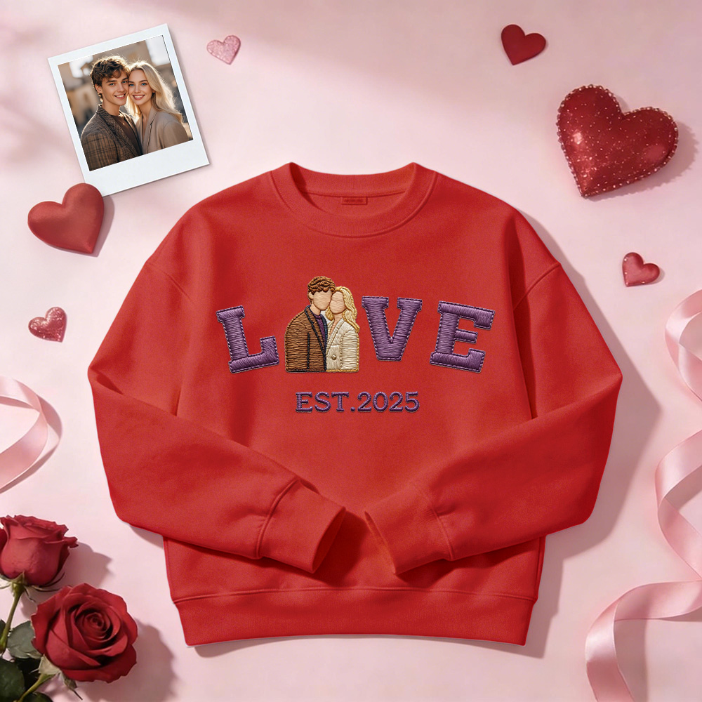 Celebrate your love with a personalized embroidered couple sweatshirt or hoodie, crafted to turn your favorite photo into a timeless stitched design. Featuring a custom couple portrait, romantic LOVE text, and your special EST year, this piece is made to commemorate meaningful moments in a subtle yet lasting way.