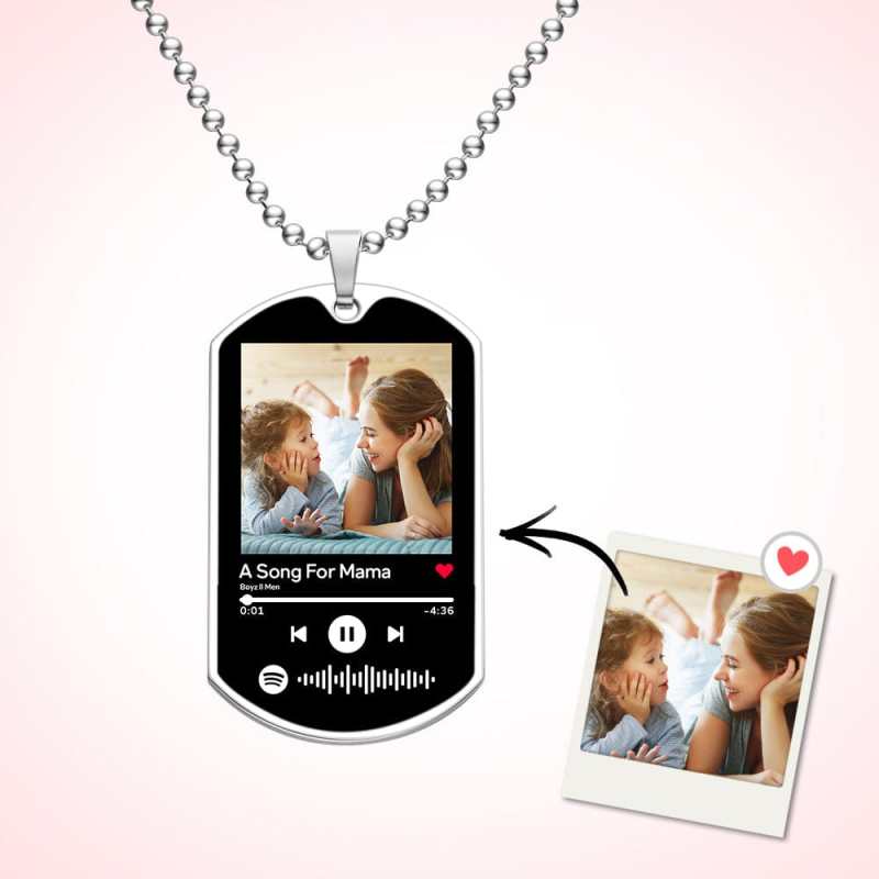 Make a unique and memorable gift for her/him, any Holiday or special occasion with this customizable ID Tag. Just add your favorite picture at the front and a Music code with your selected song or a playlist on the back.